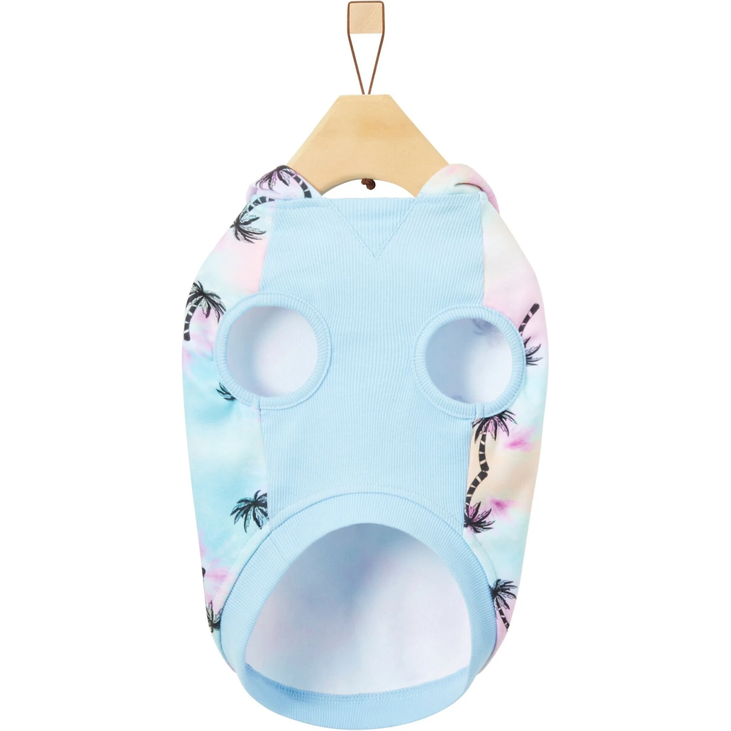 - Design features a blue tie-dye color scheme with plenty of palm trees, making it a cute staple for your pet’s spring and summer wardrobe.